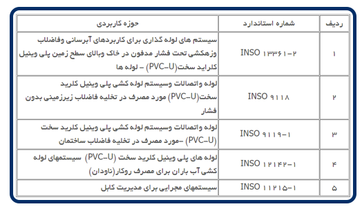 با توجه به گستردگی موارد کاربردلوله های پی وی سی، موسسهی استاندارد ملی ایران برای هریک از حوزه های کاربرد این لوله ها به صورت جداگانه استانداردی را تدوین نموده است که در جدول زیر شرح داده شده اند.