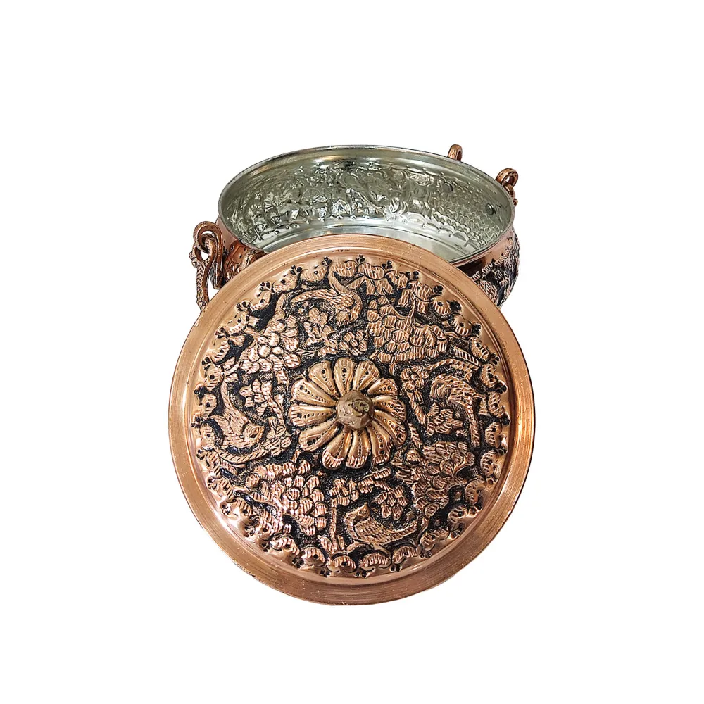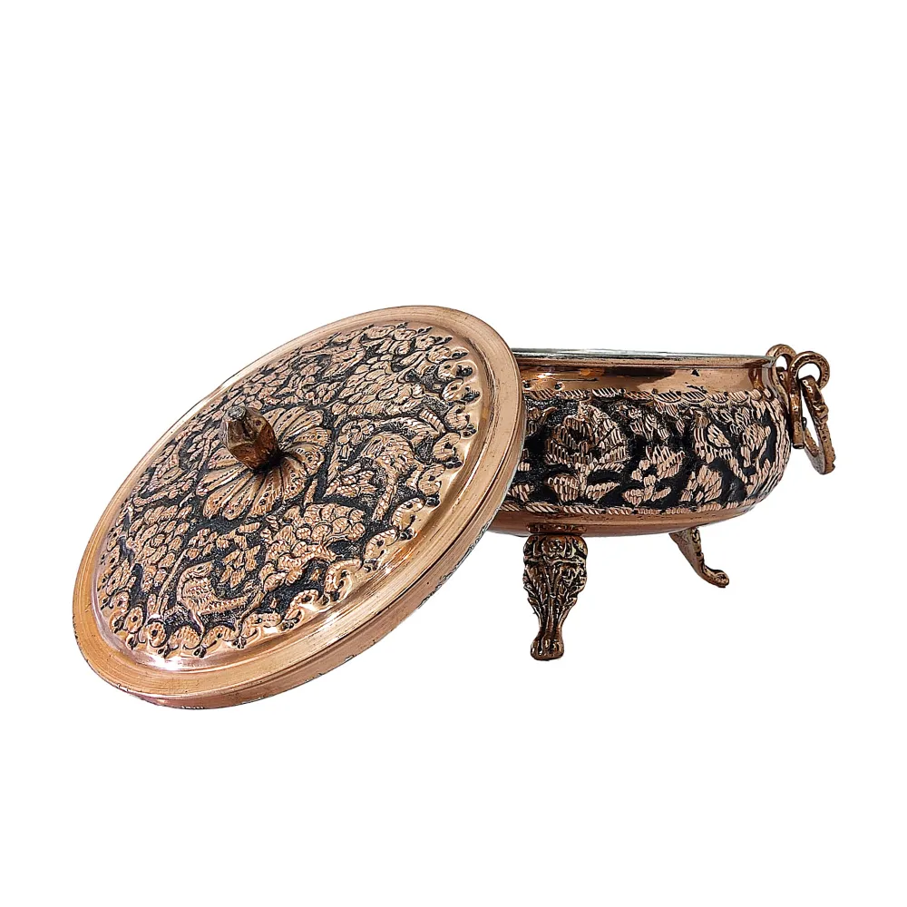 سوپ خوری مسی پایه دار جزو ظروف پرطرفدار و با کیفیت است که زیبایی منحصر به فردی نیز دارد. این سوپ خوری برای سرو انواع آش، سوپ و حتی به عنوان شکلات خوری یا آجیل جوری استفاده می شود. این سوپ خوری مسی علاوه بر کیفیت فوق العاده بالایی که دارد ظاهر زیبا و دلربایی دارد که الماس تراش و سیاه قلم نیز بر روی آن انجام شده و زیبایی آن را چند برابر کرده است.