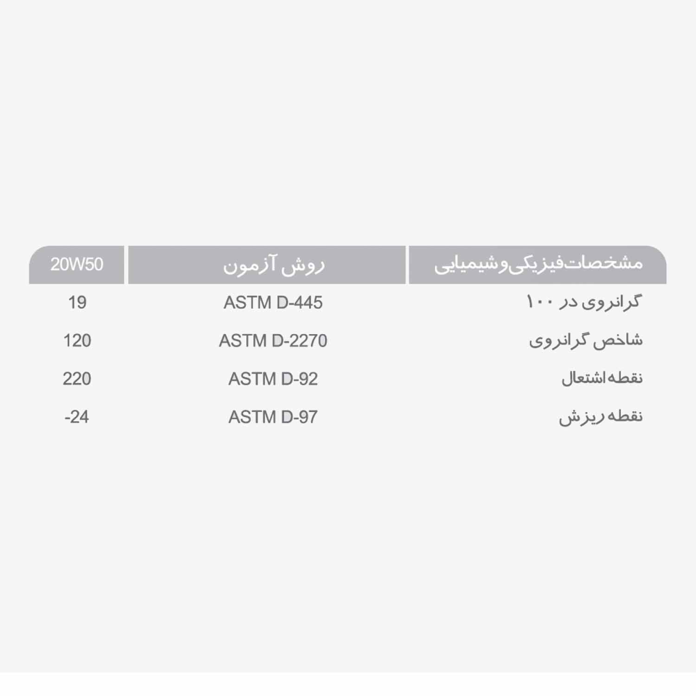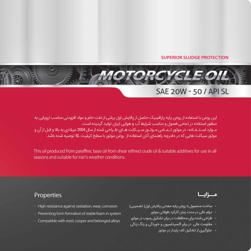روغن موتور سیکلت SAE 20W - 50 با استفاده از روغن پایه پارافینیک حاصل از پالایش اول برشی از نفت خام و مواد افزودنی مناسب اروپایی برای استفاده در تمامی فصول و شرایط آب و هوایی ایران تهیه شده است.