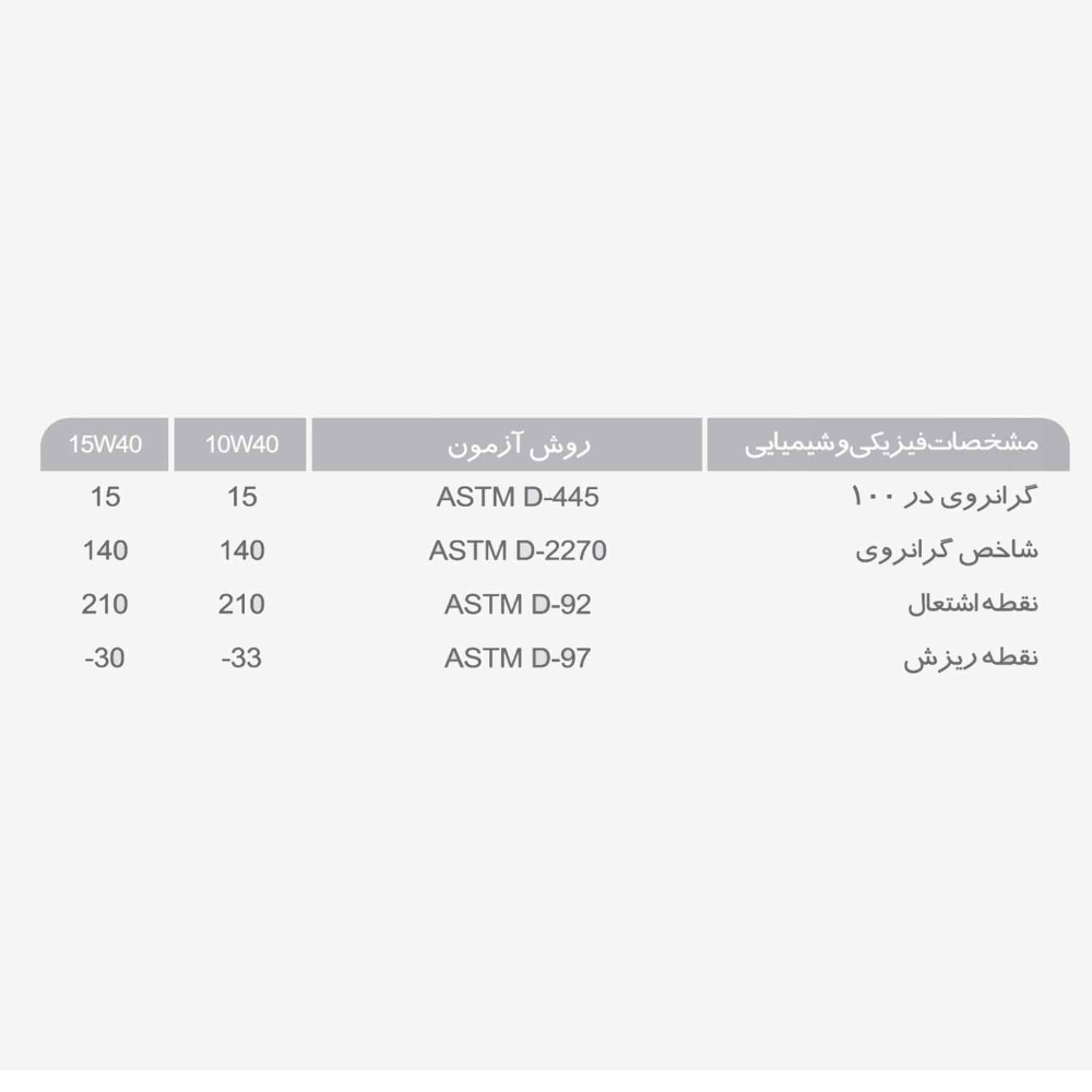 مزایا: محافظت از موتور در ترافیک های سنگین جلوگیری از تشکیل کف پایدار در موتور مقاومت بالا در برابر اکسیداسیون، زنگ زدگی و خوردگی محافظت در برابر تشکیل رسوب دوام بالا در مدت زمان کارکرد طولانی