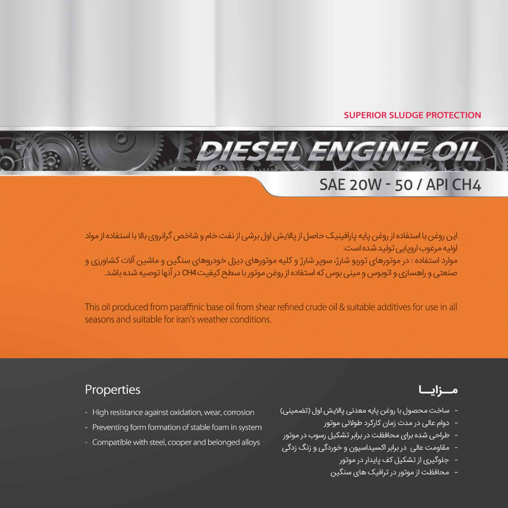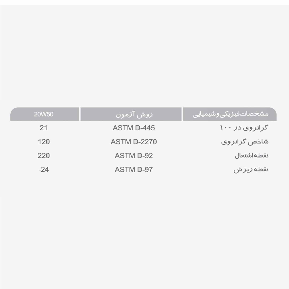روغن موتور SAE 20W - 50 با استفاده از روغن پایه پارافینیک حاصل از پالایش اول برشی از نفت خام و شاخص گرانروی با استفاده از مواد اولیه مرغوب اروپایی تولید شده است.