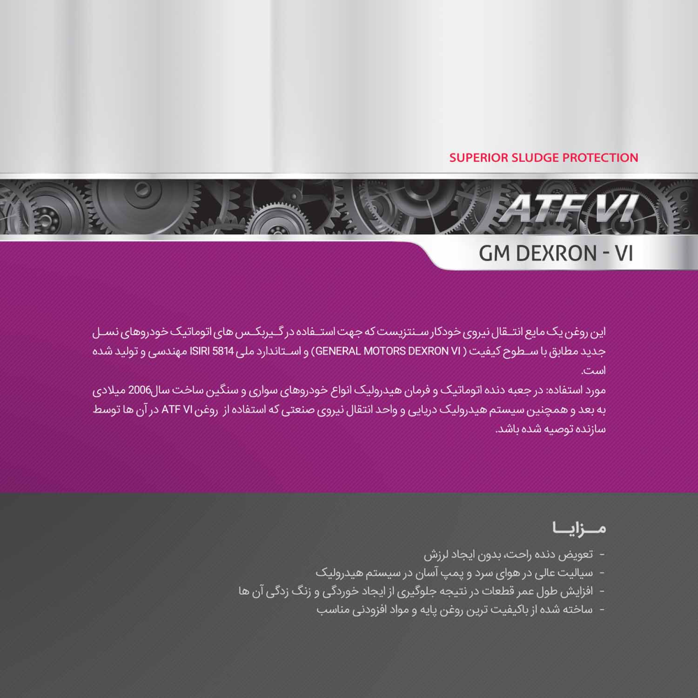 مزایا: تعویض دنده بدون لرزش و راحت سیالیت عالی در هوای سرد و پمپ آسان در سیستم هیدرولیک افزایش طول عمر قطعات و جلوگیری از ایجاد خوردگی و زنگ زدگی