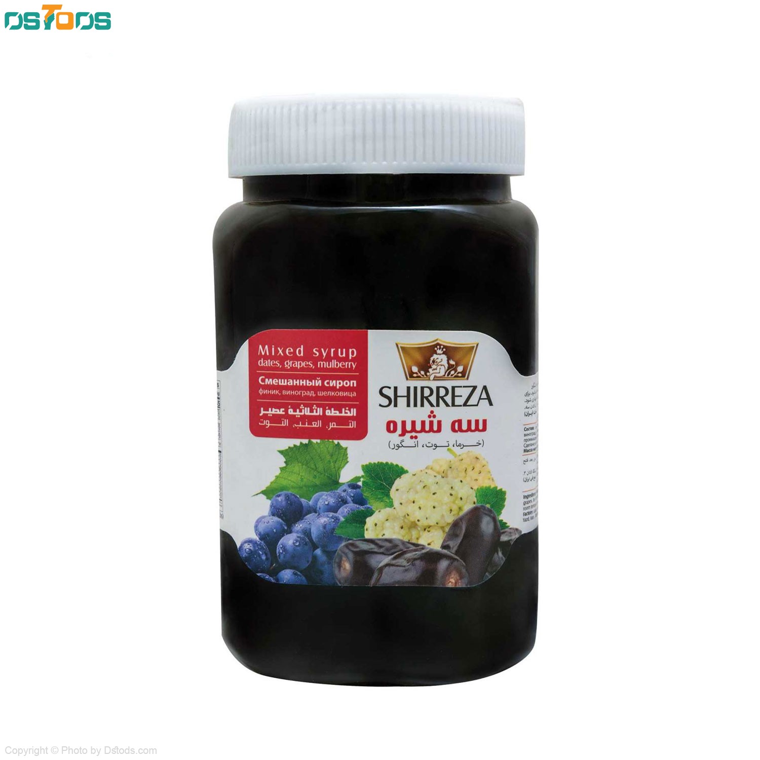سه شیره شیررضا که محصولی کاملا طبیعی و بدون مواد افزودنی و نگهدارنده میباشد که حاوی شیره خرما، شیره انگور و شیره توت است. شیره خرما حاوی پروتئین، قند طبیعی مواد معدنی و ویتامین هایی مانند B1، B2، B3 و B5 و همچنین A1 و C است که در صورت مصرف دیگر نیازی به مولتی ویتامین ها ندارید. این شیره حاوی قندهای طبیعی مانند گلوکز، ساکارز و فروکتوز هستند. شیره انگور خونساز بوده و مقوی بدن است، اگر از ضعف عمومی بدن رنج می برید یا مبتلا به کم خونی هستید می توانید سه شیره شیررضا را در برنامه غذایی خود بگنجانید. شیره توت به علت داشتن انواع ویتامینهای گروه ب در کاهش و رفع ترس، عصبانیت، خمودی و اضطراب و هیجان موثر است. همچنین مصرف این شیره به رفع بی حسی و کرختی و ضعف عمومی بدن کمک میکند. استفاده از شیره توت سفید برای کودکان و نوجوانان در حال رشد بسیار مفید است و به رشد بهتر، افزایش قدرت یادگیری و تامین انرژی مورد نیاز کودکان کمک میکند.