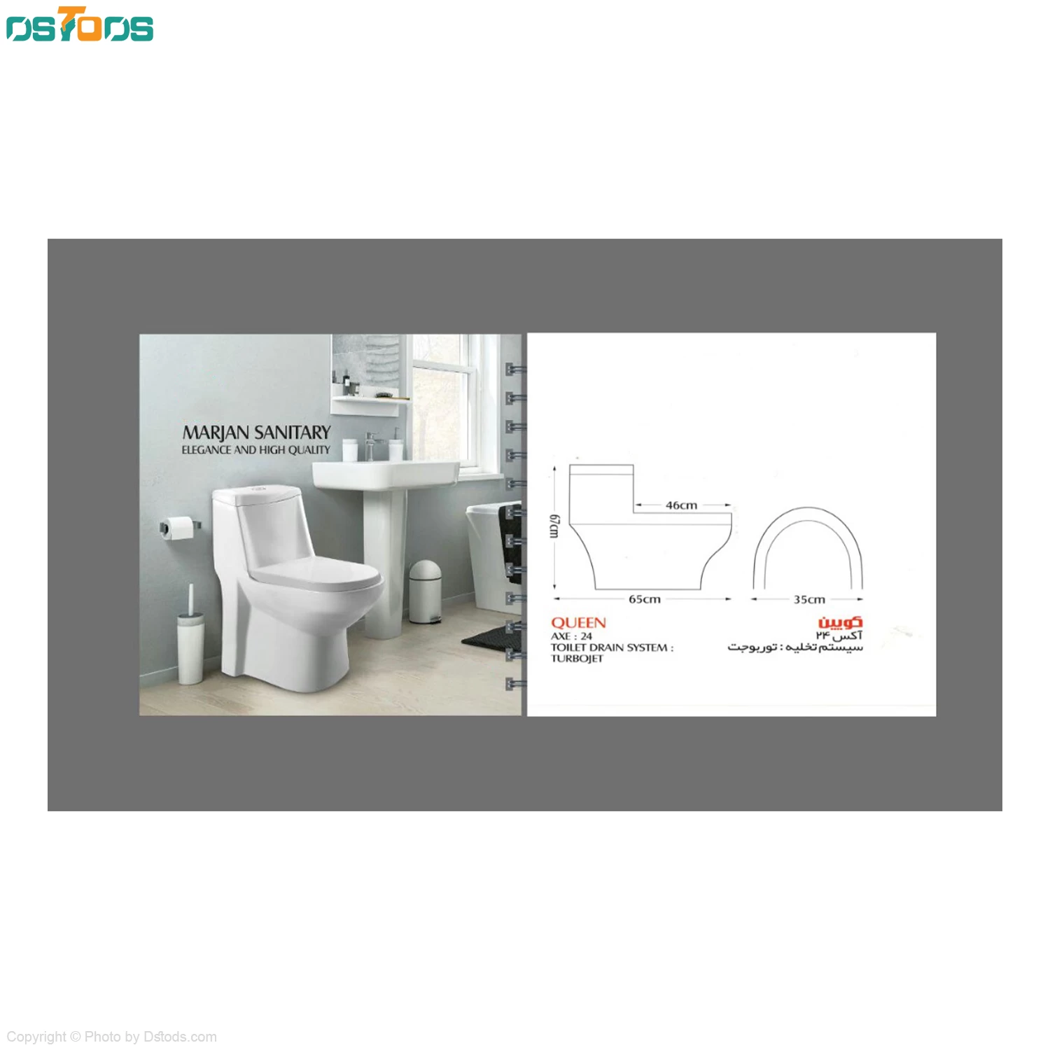 شرکت چینی بهداشتی مرجان توالت فرنگی کویین را بصورت یک تکه و سیستم فلاش دو زمانه (یعنی میتوان به صورت انتخابی کل آب موجود در منبع را تخلیه کرد یا نصف آن را که باعث کاهش مصرف آب شده ) طراحی کرده و دارای آکس تخلیه شوتینگ می باشد که با خروج آب از قسمت پایین (روبروی قسمت تخلیه سیفون) عمل تخلیه در مدت زمان بسیار کمی خواهد بود.