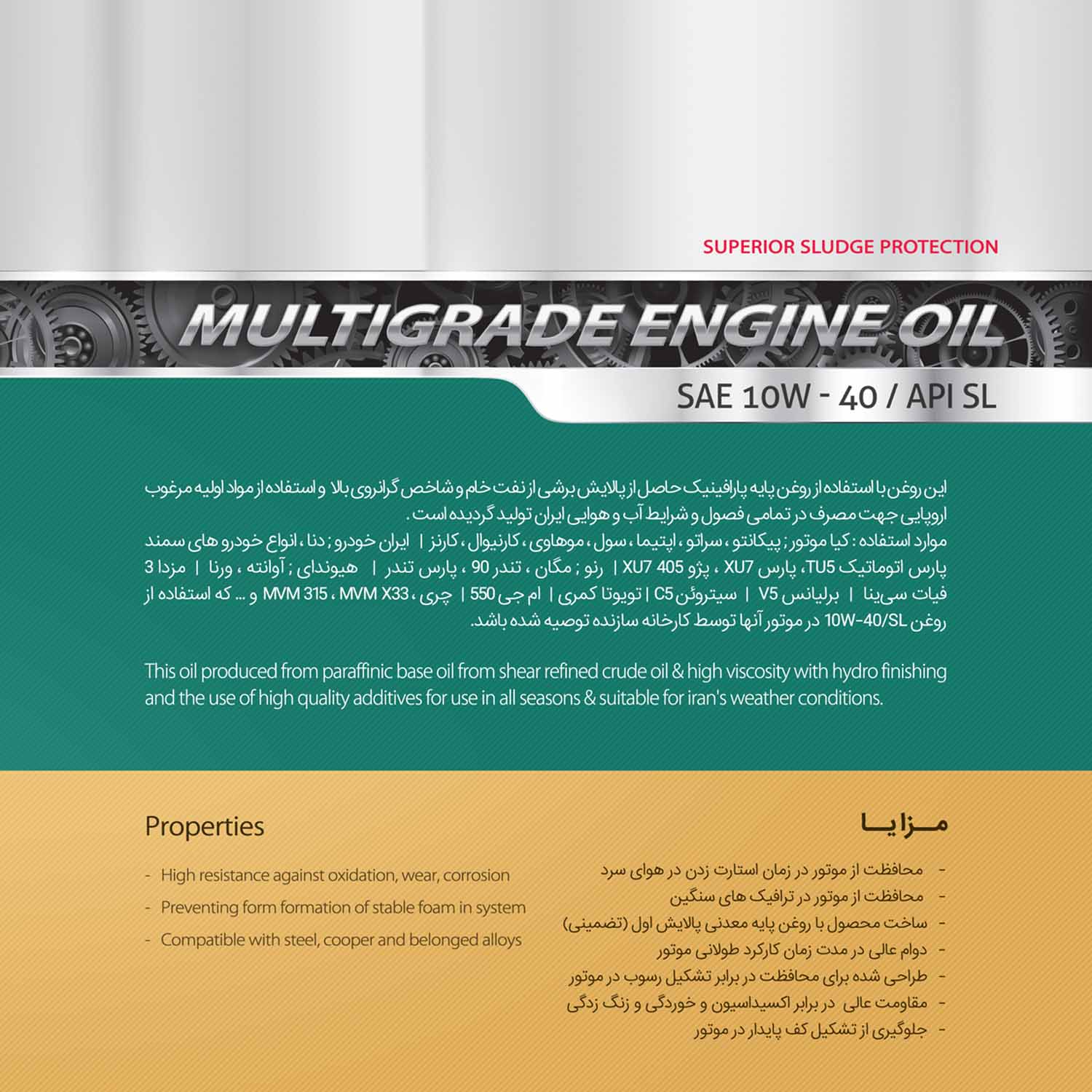 مزایا: جلوگیری از تشکیل کف پایدار در موتور محافظت از موتور در ترافیک های بزرگ و سنگین محافظت از موتور در زمان استارت زدن در فصول سرد سال مقاومت بسیار بالا در برابر خوردگی، زنگ زدگی و اکسیداسیون محافظت در برابر تشکیل رسوب