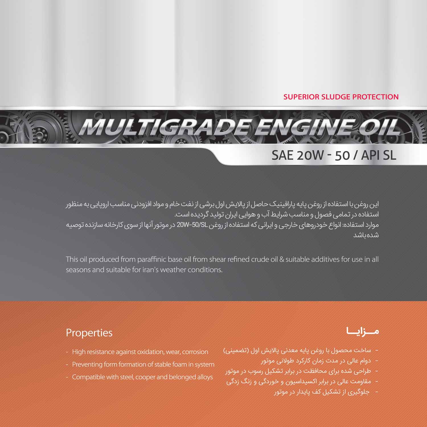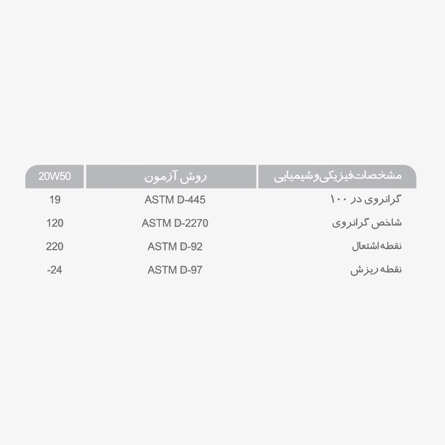 مزایا: جلوگیری از تشکیل کف پایدار در موتور دوام عالی در مدت زمان کارکرد طولانی موتور مقاومت بسیار عالی در برابر خوردگی، زنگ زدگی و اکسیداسیون محافظت در برابر تشکیل رسوب در موتور ساخت محصول با روغن پایه معدنی پالایش اول