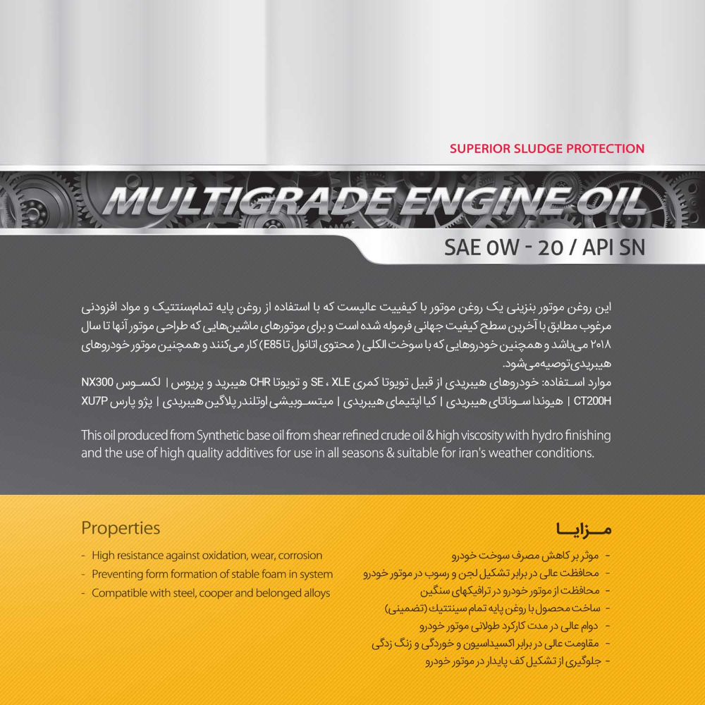 روغن موتور SAE oW -20 جی فورس یک روغن موتور بنزینی با کیفیت است که از روغن پایه تمام سنتتیک و مواد افزودنی مرغوب مطابق با آخرین سطح کیفیت جهانی فرموله شده است. این روغن موتور مناسب برای ماشین هایی است که طراحی آن ها تا سال 2018 می باشد. همچنین برای خودرو هایی که با سوخت الکلی و سوخت هیربدی کار می کنند نیز مناسب است.